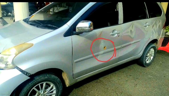 Tampak mobil tsk kejahatan sempat ditembakkan satu peluru, menyisakan lubang menganga disamping kemudi kabin penumpang depan