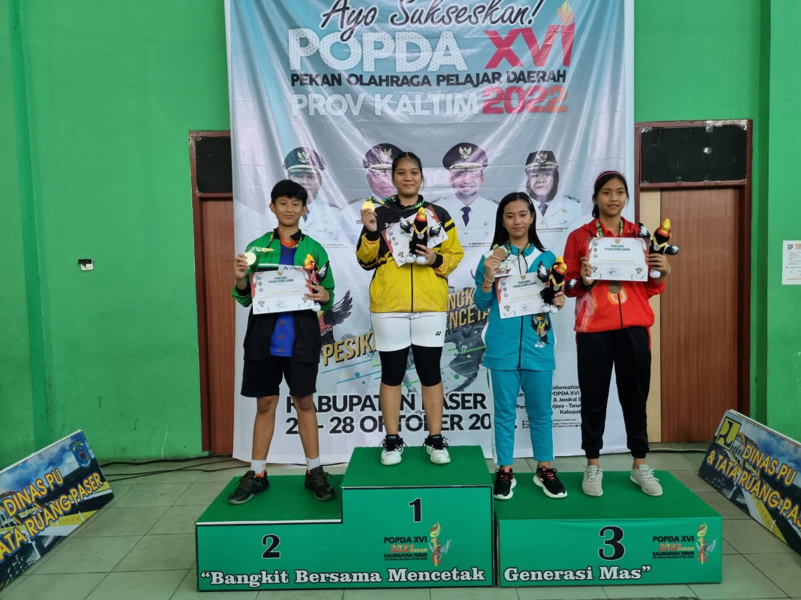 Ya, tiga emas yang didapat berasal dari sektor tunggal putri oleh Rabelvrili Cantika, tunggal putra oleh Christopher Aldrich serta ganda campuran diraih oleh pasangan M Roid-Ryani Puspita Dewi. Sementara dua emas lainnya pada sektor ganda putri dan ganda putra didapat oleh kontingen Bontang.