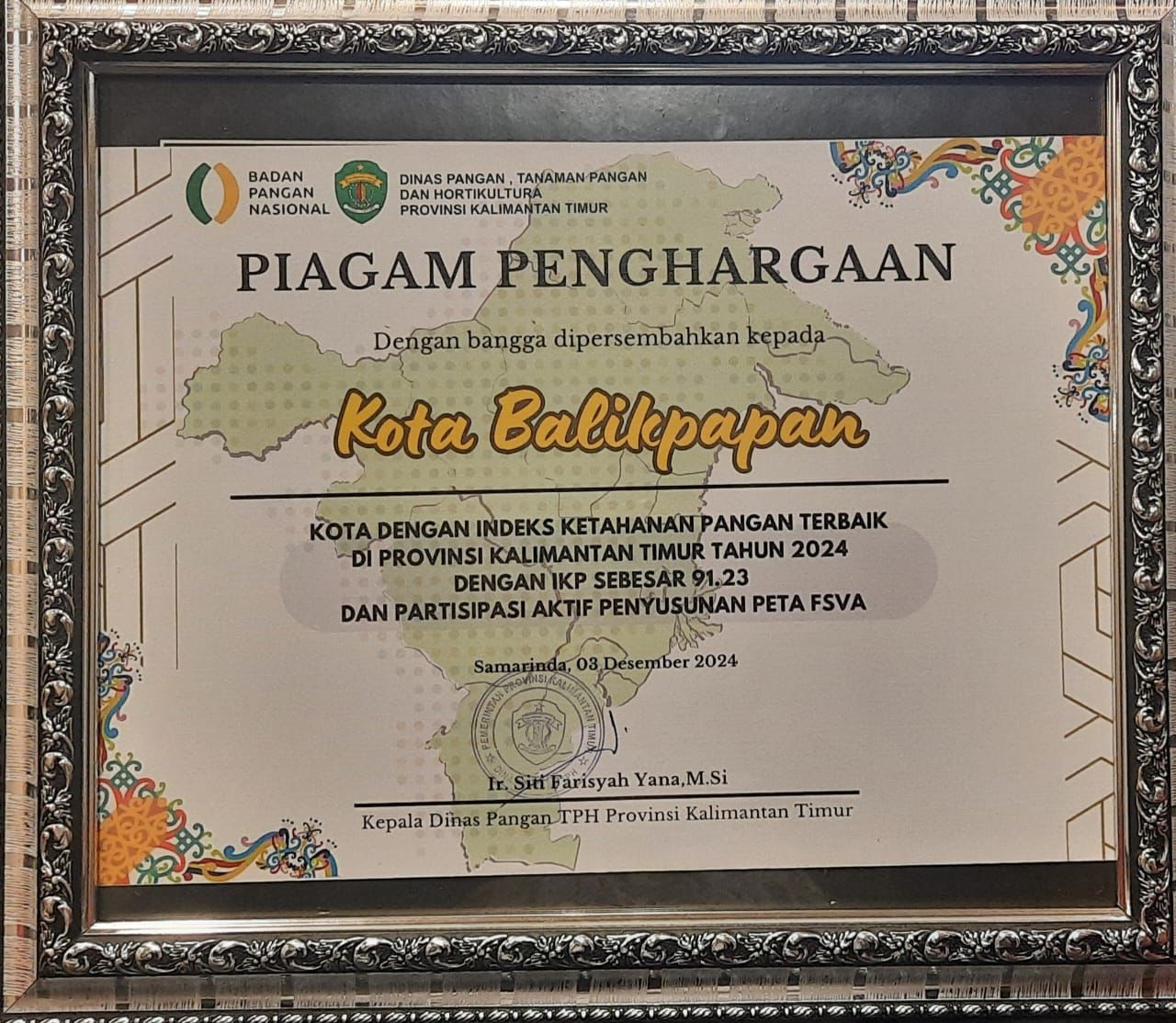 Penghargaan tersebut diserahkan langsung oleh Kepala Dinas Pangan, Tanaman Pangan, dan Hortikultura (TPH) Provinsi Kaltim, Ir. Siti Farisyah Yana kepada Kepala Dinas Pangan, Pertanian, dan Perikanan (DP3) Balikpapan, Sri Wahjuningsih, pada Selasa (3/12/2024).