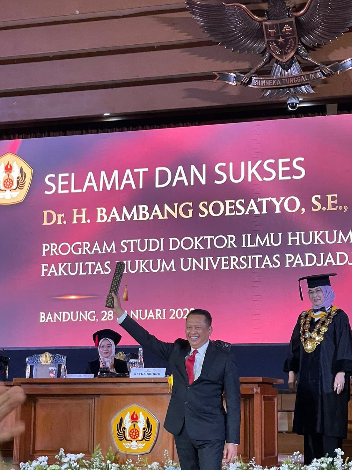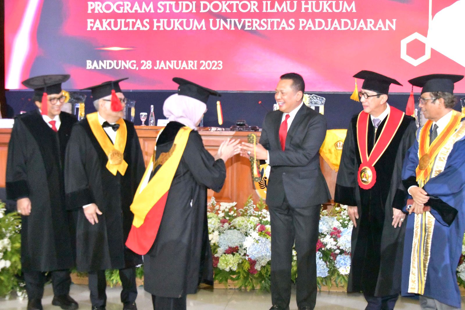 Sedang Bamsoet menyajikan disertasi berjudul “Peranan dan Bentuk Hukum Pokok-Pokok Haluan Negara (PPHN) sebagai Payung Hukum Pelaksanaan Pembangunan Berkesinambungan dalam Menghadapi Revolusi Industri 5.0 dan Indonesia Emas.”