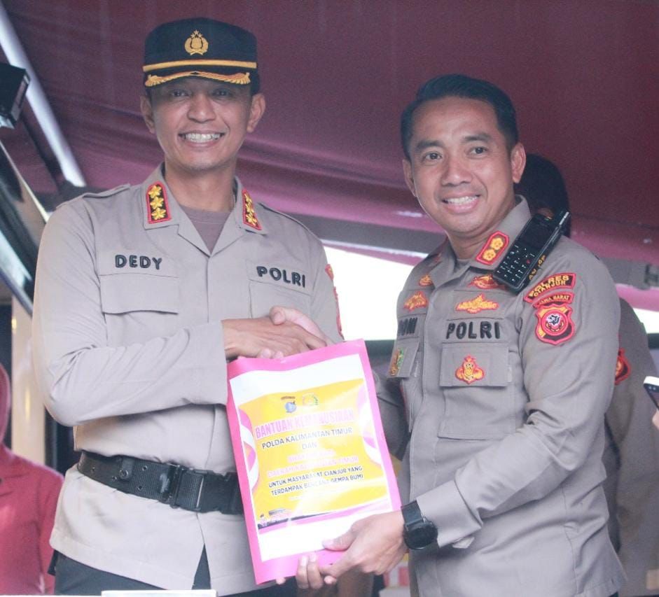 Bantuan tersebut secara simbolis diserahkan oleh Direktur Intelkam Polda Kaltim mewakili Kapolda Kaltim Irjen Pol Imam Sugianto kepada Wakapolda Jabar Brigjen Pol Bariza Sulfi dan Kapolres Cianjur AKBP Doni Hermawan.