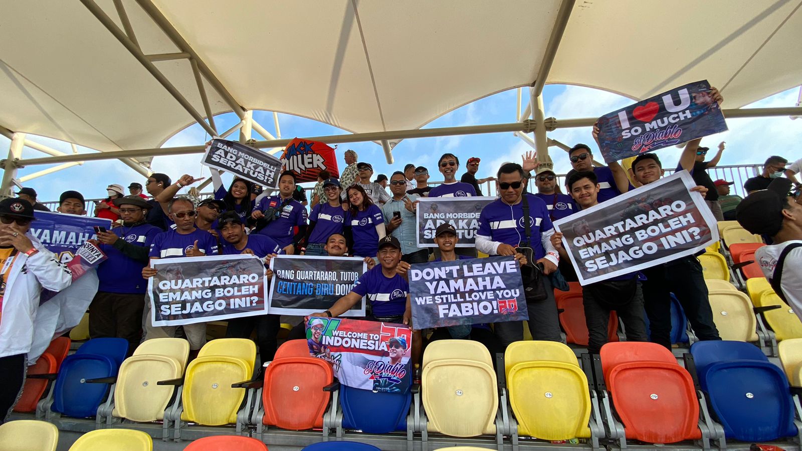 Pagi itu, seluruh peserta kompak mengenakan kaus biru Yamaha ngeluruk ke Sirkuit Mandalika. Mereka juga membawa spanduk mini dengan tulisan unik dan kreatif sebagai dukungan untuk Yamaha Racing Team. Konten kreator asal Samarinda yang memiliki followers Instagram 647 ribu, Irfan Ghafur, membentangkan spanduk bertuliskan “Don’t Leave Yamaha. We Still Love You Fabio” dan tulisan “Bang Quartararo, Tutor Centang Biru Dong”. Sedangkan konten kreator asal Balikpapan, Fazri Kecap, membentang tulisan “Quartararo Emang Boleh Sejago Ini?”.