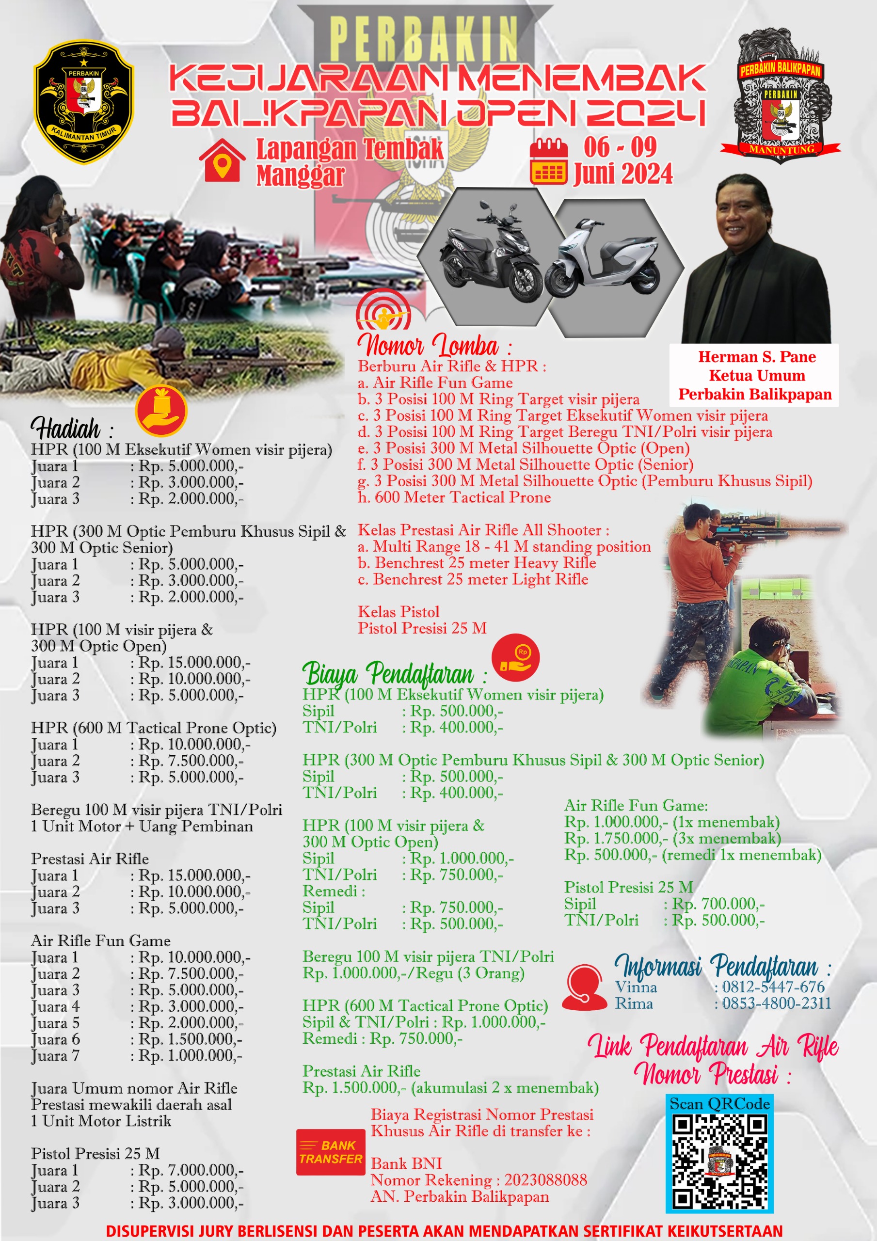 “Event yang sudah dikalenderkan setiap tahunnya sebagai ajang pencarian bakat, dan tentunya para pengemar olah raga menembak. Dan event ini pun terbuka buat seluruh penembak dari Sabang sampai Merauke, TNI, Polri, sipil dan instansi lainnya,” terang Herman.