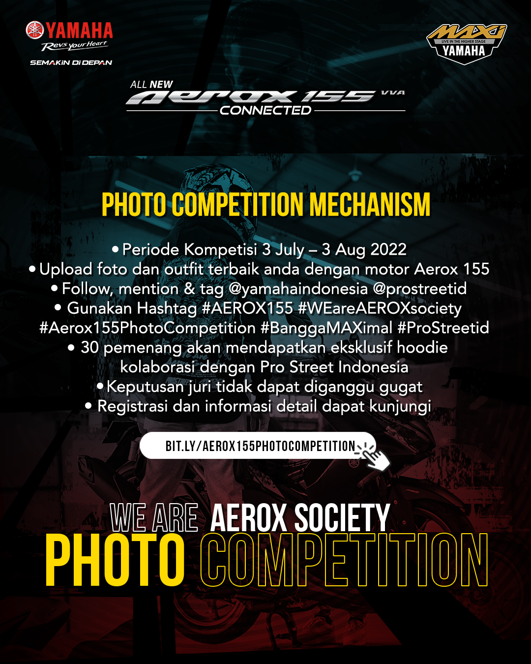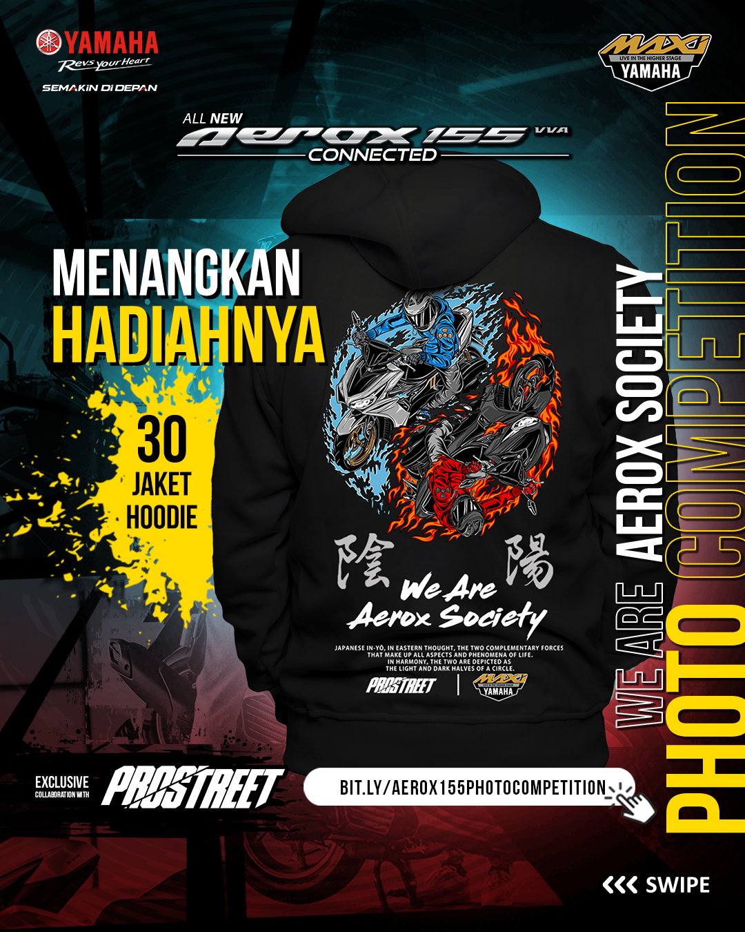 Ayo tunggu apa lagi segera daftar dan ikuti kompetisi foto #WEareAEROXsociety untuk memenangkan Jaket Hoodie eksklusif karya kolaborasi Yamaha dan Pro Street Indonesia. Para pemenang kompetisi ini selanjutnya akan diumumkan melalui akun Instagram @yamahaindonesia. (*/bie)