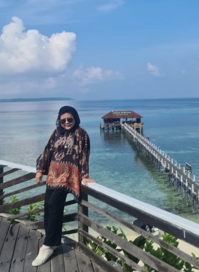 Bu Mei dengan latar belakang salah satu resort di Maratua.