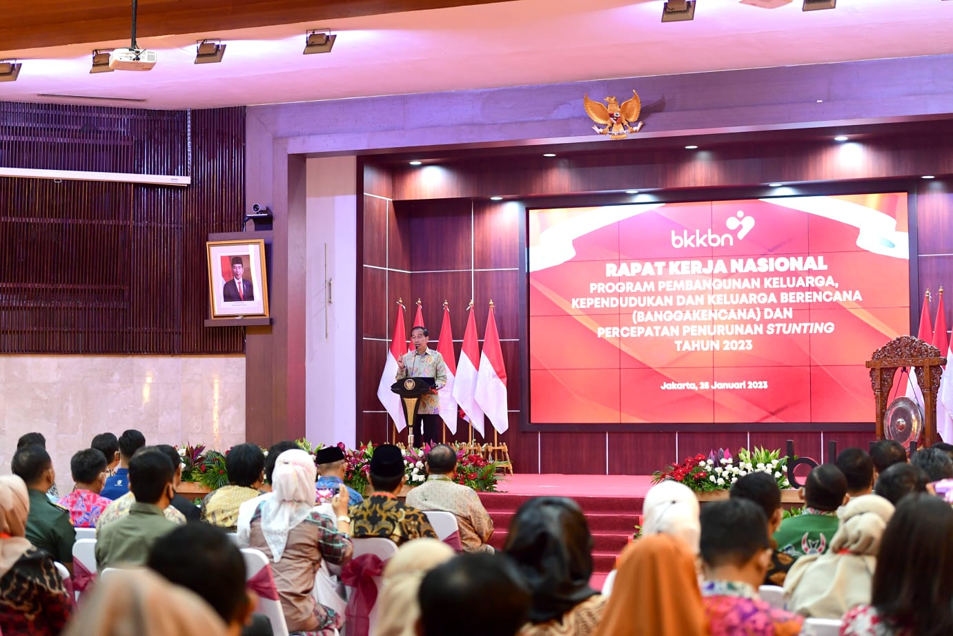 Jakarta - Presiden Joko Widodo secara resmi membuka Rapat Kerja Nasional (Rakernas) Program Pembangunan Keluarga, Kependudukan, dan Keluarga Berencana (Banggakencana) dan Percepatan Penurunan Stunting Tahun 2023, yang digelar di Auditorium BKKBN, Halim Perdanakusuma, Jakarta, pada Rabu, 25 Januari 2023.