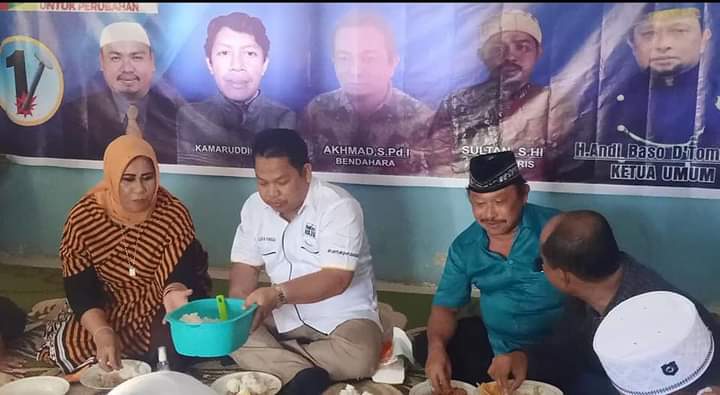 Tampak ketua DPD Berkarya Andi Baso didampingi ketua DPW Berkarya Kaltim Sumaria duduk lesehan makan siang bersama di tengah hajatan keluarga besar Manurung Arung Matajang