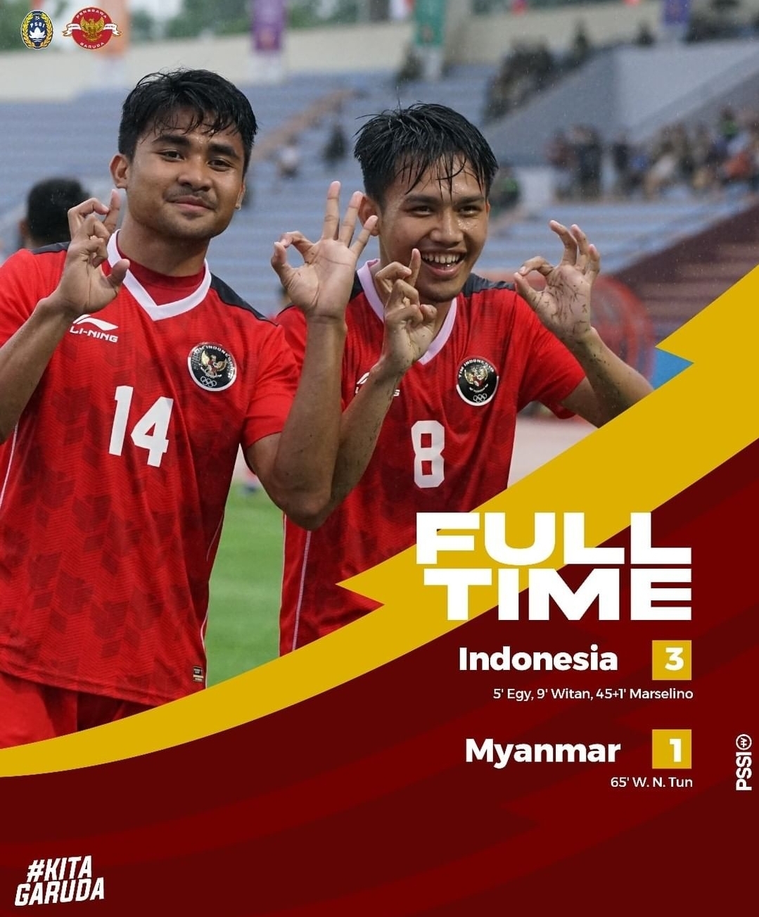 Di Viet Tri Stadium, Phu Tho, Vietnam, Minggu (15/5/2022), Indonesia mencetak tiga gol pada babak pertama. Gol itu dikemas oleh Egy Maulana Vikri, Witan Sulaeman, dan Marselino Ferdinan. Myanmar sekali membukukan gol dari Win Naing Tun pada babak kedua.