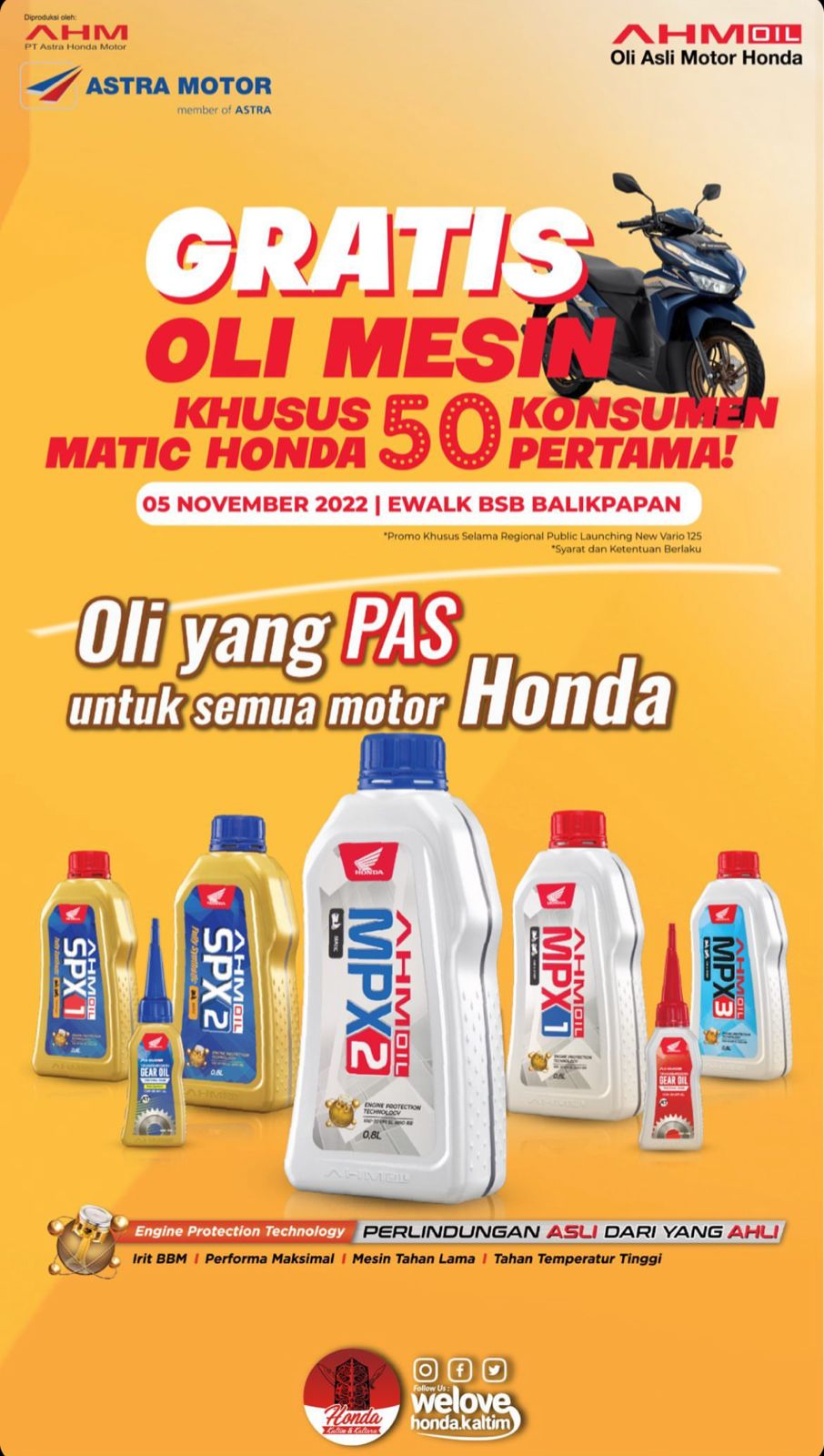 Pada kali ini, Astra Motor Kaltim 1 memberikan promo berupa ganti oli mesin gratis khusus konsumen matic Honda dan berlaku hanya 50 konsumen pertama. Program tersebut hanya berlaku pada 5 november saat launching New Honda Vario125 berlangsung.