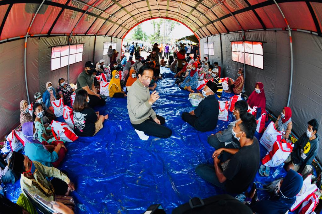 Lumajang- warga terdampak erupsi Gunung Semeru bercerita kepada Presiden Joko Widodo saat meninjau langsung posko pengungsian yang terletak di Lapangan Desa Sumberwuluh, Kecamatan Candipuro, Kabupaten Lumajang, Provinsi Jawa Timur, pada Selasa, 7 Desember 2021.