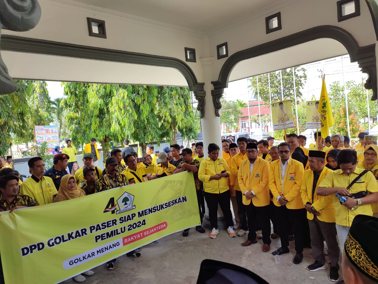 Ratusan masa yang terdiri dari kader, bacaleg dan anggota partai berwarna kuning logo pohon beringin ini berjalan kaki menuju kantor KPU Paser diiringi sholawat dan juga kesenian daerah.