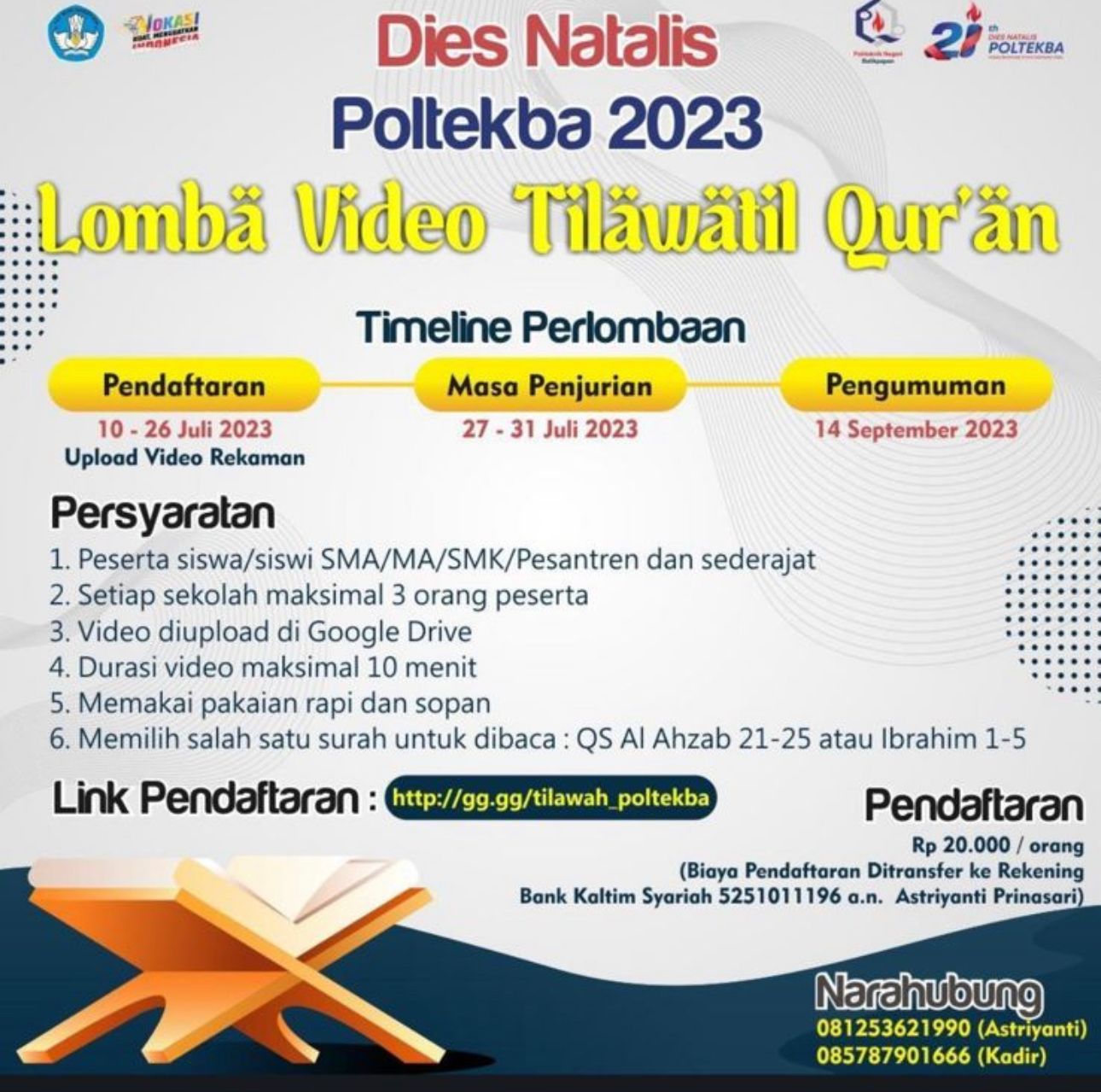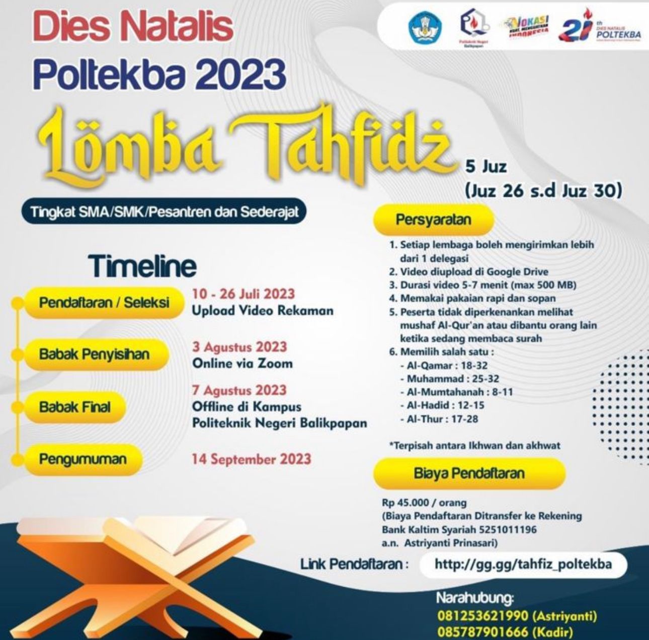 Ketua Panitia Dies Natalis 2023 Poltekba Danar Retno Sari, S.Kom., M.Kom mengatakan dua lomba ini dilaksanakan untuk tingkat pelajar. Bagi lomba tahfidz pendaftaran atau seleksi dibuka sejak 10-26 Juli 2023. Setelah pendaftaran selesai, masuk ke tahap babak penyisihan dan pengumuman.