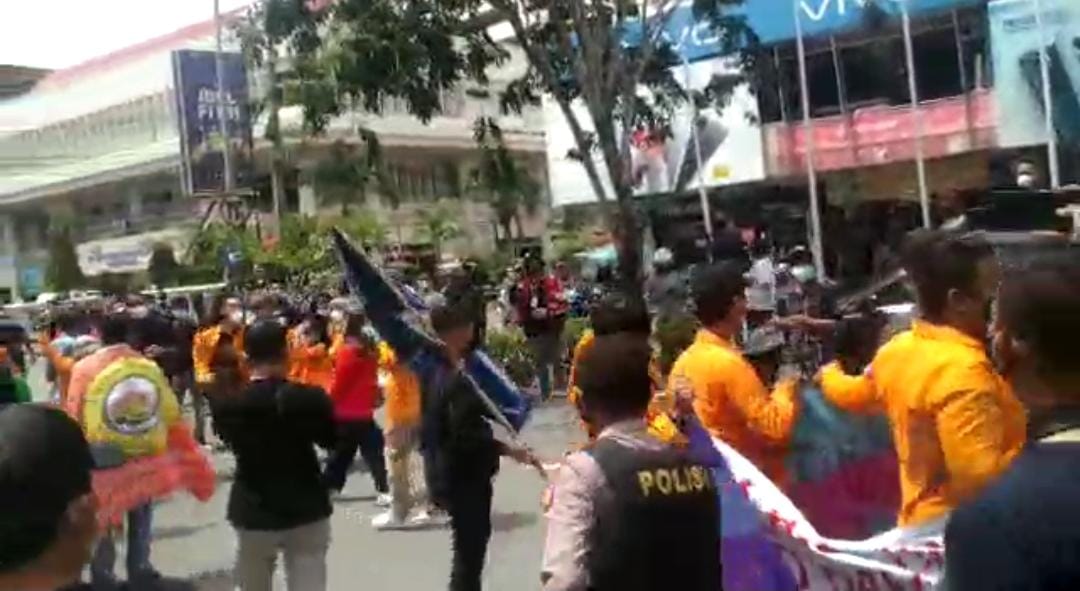 KaltimKita.com, BALIKPAPAN - Simpang Tiga Balikpapan Plaza pecah, Kamis (22/7/2021) siang. Hal ini buntut ricuhnya aksi demonstrasi yang dilakukan ratusan mahasiswa. Mereka meminta