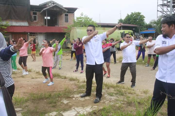 Cabup/cawabup nomor urut 1 Mahyunadi dan Lulu Kinsu senam sehat bersama emak-emak Desa Batu Balai Kecamatan Muara Bengkal.