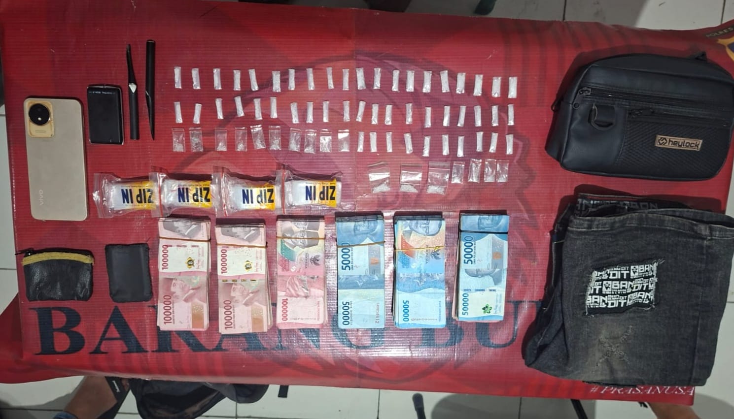"Dari hasil penggeledahan, petugas menemukan 67 paket plastik klip berisi serbuk kristal putih diduga sabu dengan berat bruto 16,84 gram, beserta sejumlah barang bukti lain seperti timbangan digital, plastik klip kosong, alat takar, handphone, tas selempang, serta uang tunai sebesar Rp57 juta yang diduga hasil transaksi narkoba," ungkap Kapolres Paser melalu Kasat Resnarkoba, AKP Suradi.