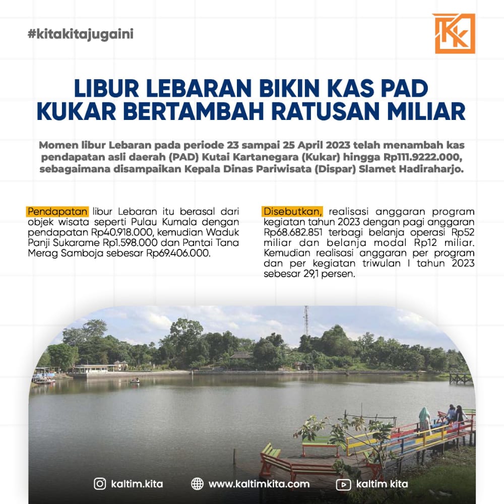 Kaltimkita.com, KUTAI KARTANEGARA - Momen libur lebaran lalu disampaikan oleh Dinas Pariwisata (Dispar) Kabupaten Kutai Kartanegara (Kukar) berhasil mengumpulkan pundi-pundi rupiah untuj Pendapatan Asli Daerah (PAD) sebesar Rp111.922,000. Secara keseluruhan realisasi pendapatan Triwulan I tahun 2023 mencapai Rp343,769.000,-.