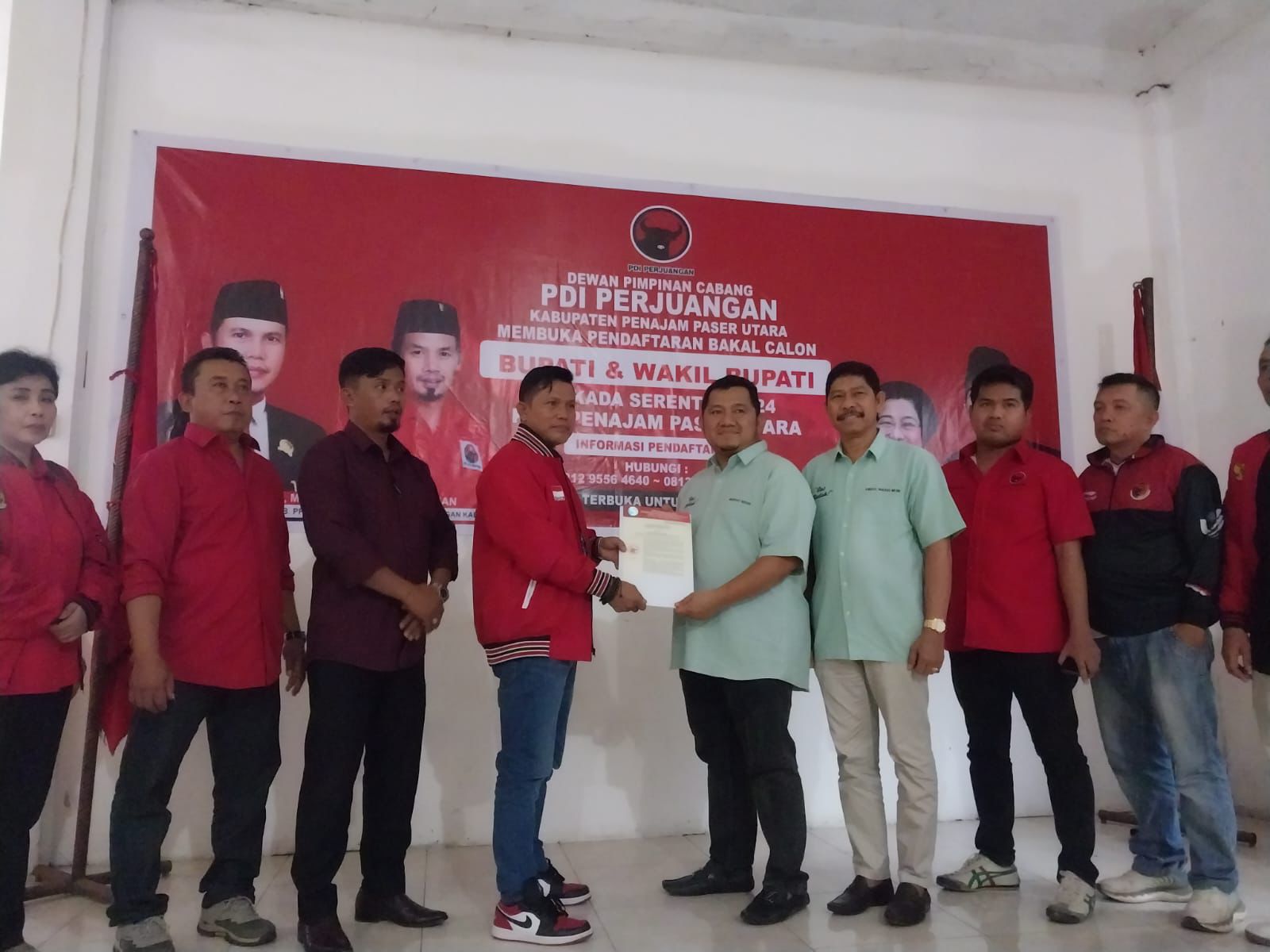 Kaltimkita.com, PENAJAM- Bakal Pasangan Calon (Paslon) Bupati dan Wakil Bupati Penajam Paser Utara (PPU), Mudyat Noor- Abdul Waris Muin menerima langsung surat keputusan (SK) pengusungan Partai Demokrasi Indonesia Perjuangan (PDIP) di Sekretariat Dewan Pimpinan Cabang (DPC) PDIP PPU di Jalan Provinsi Km 5, Kelurahan Nenang, Kecamatan Penajam, Selasa (27/8/2024). SK pengusungan tersebut diserahkan langsung oleh Ketua DPC PDIP PPU, Hartono Basuki ke Mudyat Noor dan Abdul Waris Muin.