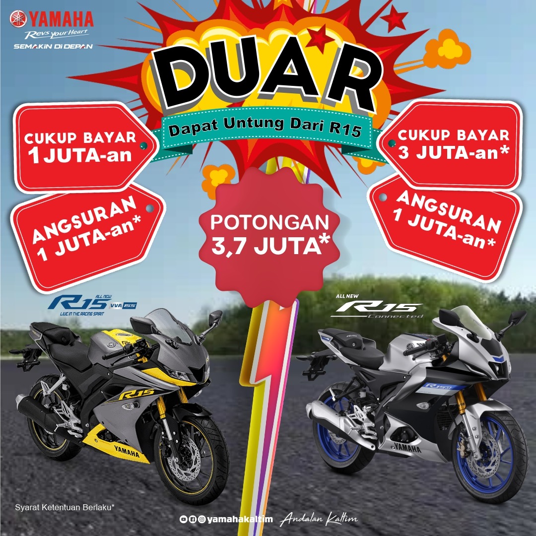 “Karena dengan promo DUAR ini, kalian hanya dengan DP alias uang muka Rp 1jutaan saja sudah bisa bawa pulang motor Yamaha sport All New R15 VVA. Ngeri kan, buruan geber sudah, gak pake lambat,” uajrnya.