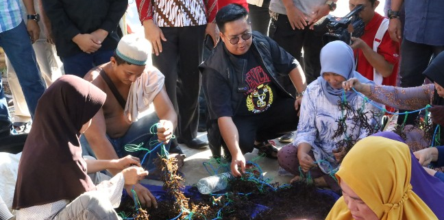 Ia juga meninjau langsung proses pembudidaya rumput laut, serta menyerahkan bantuan bibit rumput laut kepada petani pembudidaya dan beberapa peralatan penunjang pembudidayaan.