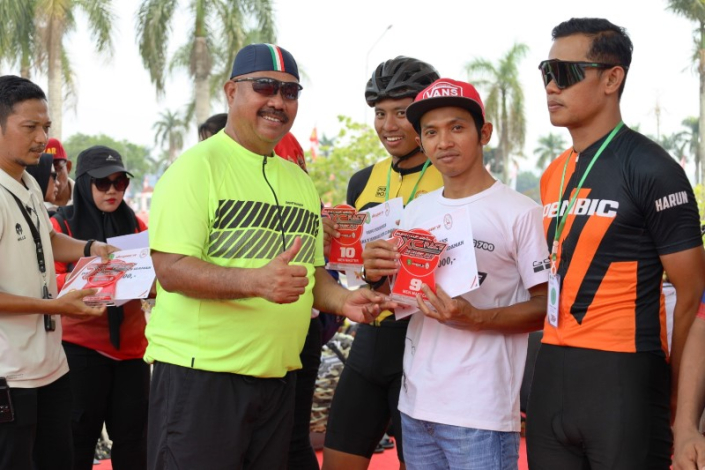 Kaltimkita.com, KUTAI KARTANEGARA – Bupati Kutai Kartanegara (Kukar) Edi Damansyah serahkan hadiah pemenang gowes yang finish tercepat pada event Jambore Mountain Bike (MTB) ke-10 se-Kalitm, di halaman parkir Kantor Bupati Kukar, Minggu (08/10/2023).