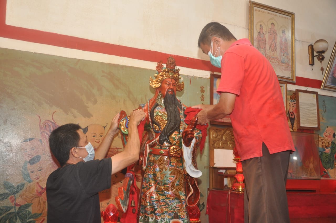 Seorang Warga Tionghoa sedang membersihkan patung di Kelenteng tersebut. (Kaltimkita.com)