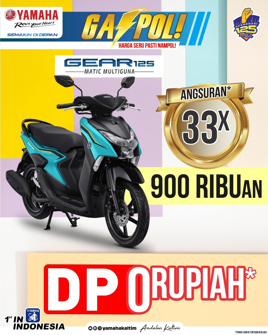 Dengan promo Gaspol, kalian yang ingin membawa pulang Yamaha Gear 125 sangat dimudahkan. Pasalnya dengan Gaspol kalian tidak harus membayar uang muka alias DP.