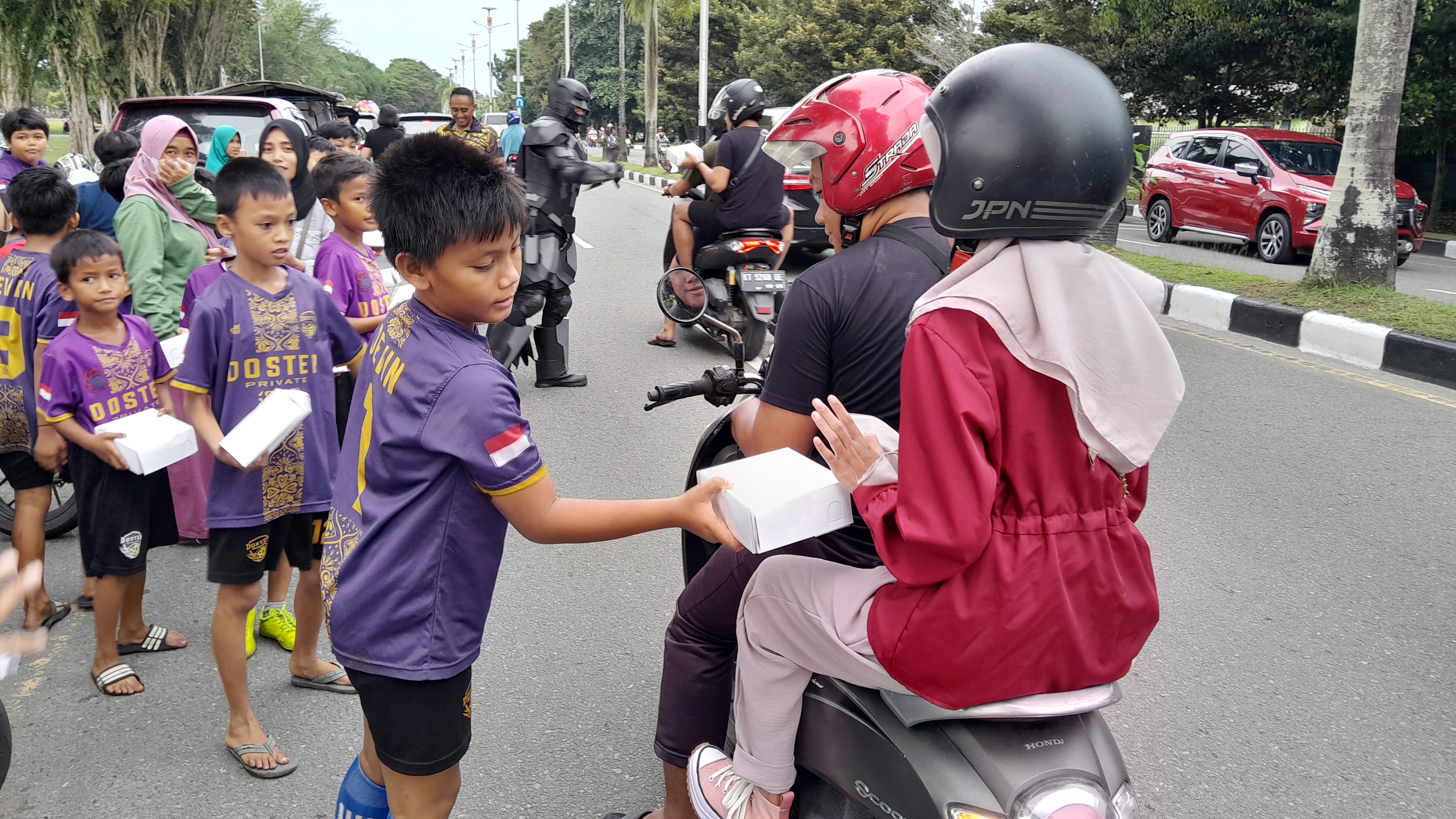 KaltimKita.com, BALIKPAPAN - SSB Dostep Private Balikpapan gelar bakti sosial di Lapangan Merdeka, Jumat (7/4/2023). Mereka berbagi takjil kepada para pengendara yang melintas.Total 350 kotak dibagikan hasil swadaya orang tua dan manajamen.