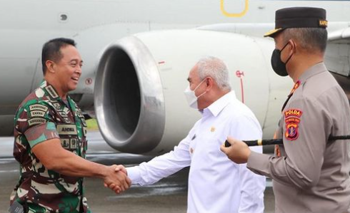 Kaltimkita.com, BALIKPAPAN - Gubernur Kaltim Dr H Isran Noor bersama Pangdam VI Mulawarman Mayjeni TNI Tri Budi Utomo dan Kapolda Kaltim Irjen Pol Imam Sugianto secara khusus menyambut kedatangan Panglima TNI Jenderal Andika Perkasa di Bandara Sultan Aji Muhammad Sulaiman Sepinggan Balikpapan, Jumat (5/8/2022).