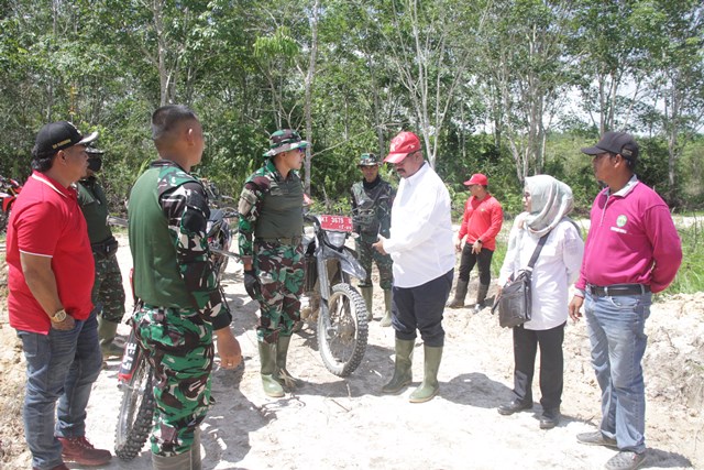 Menyusuri jalan yang telah dibuat melalui program TMMD sepanjang 8,9 km, Edi Damansyah bersama rombongan beberapa kali turun dari motor trail dalam melakukan koordinasi bersama rombongan apa saja yang masih kurang dalam pembuatan jalan tersebut.