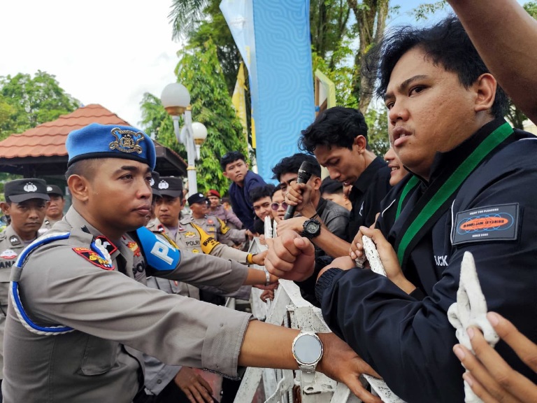 Ada momen mereka mendesak masuk meski pagar ditutup rapat dan dikawal oleh aparat. Alhasil sempat terjadi aksi saling tarik menarik pagar antara demonstran dan kepolisian.