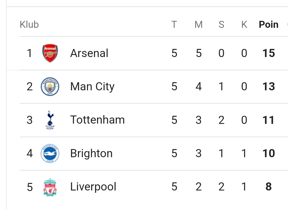 Skor 2-1 bertahan untuk kemenangan Arsenal. The Gunners terus kukuh di puncak Klasemen Liga Inggris sementara dengan 15 poin dari lima laga.