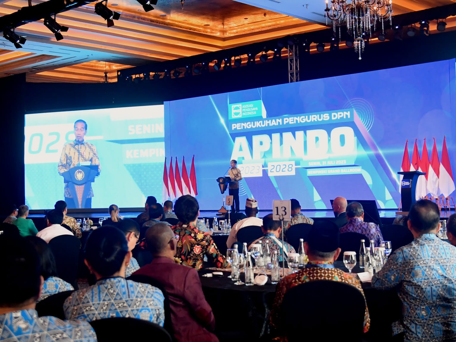 JAKARTA - Presiden Joko Widodo menghadiri Pengukuhan Dewan Pimpinan Nasional (DPN) Asosiasi Pengusaha Indonesia (Apindo) masa bakti tahun 2023-2028 di Grand Ballroom Hotel Kempinski, Jakarta, pada Senin, 31 Juli 2023.