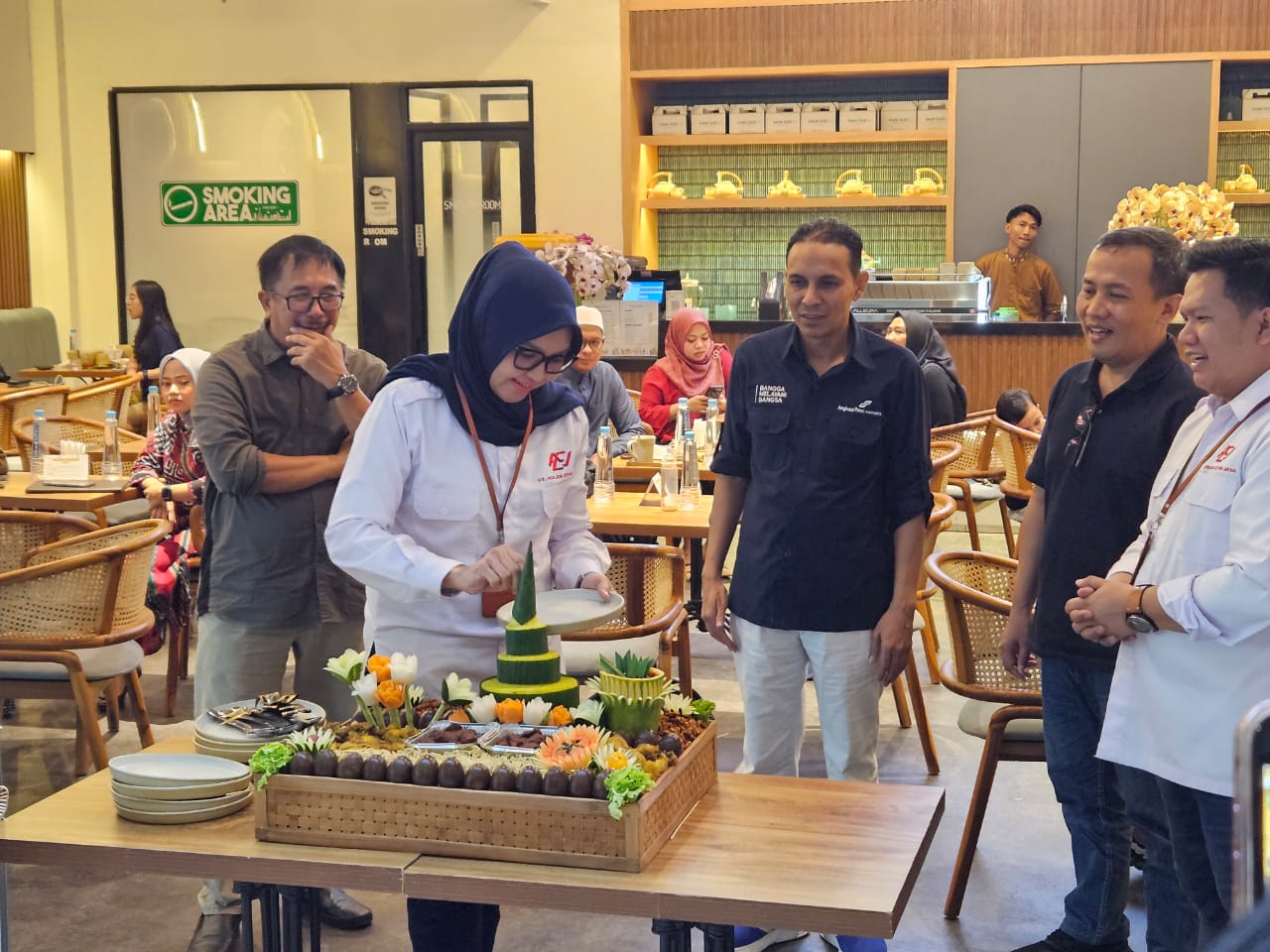 Peresmian Han Soe Tiam ditandai dengan pengguntingan pita. Lalu pemotongan nasi tumpeng oleh istri Bung Arul, Ayu Renia Putri. Saya dan GM Angkasa Pura 1 Sepinggan Ahmad Syaugi diminta ikut mendampingi. Kebagian juga tumpengnya. Penuh berkah setelah dibacain doa.