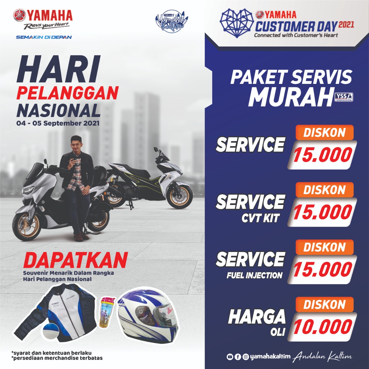 PT. Surya Timur Sakti Jatim (STSJ) sebagi main dealer area Kaltim telah menyiapkan program spesial dalam menyambut Hari Pelanggan Nasional 2021. Bersama dengan jaringan bengkel dan dealer resmi Yamaha, akan memberikan potongan harga bagi konsumen. Sebagai bentuk rasa kekeluargaan antar konsumen loyal Yamaha, pihak STSJ menggelar program bertajuk Yamaha Customer Day. Di Program Yamaha Customer Day ini, Yamaha akan memberikan diskon spesial untuk jasa servis yang bisa didapatkan oleh konsumen mulai tanggal 4-5 September 2021.