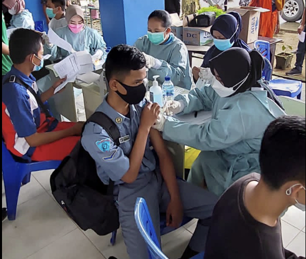 KaltimKita.com, BALIKPAPAN - Herd Immunity para pelajar SMKN 5 Balikpapan mulai terbentuk. Kenapa tidak, mereka telah mendapat 1077 dosis vaksin Sinovac. Jumlah tersebut menyasar kepada seluruh siswa. Ya, Kamis (16/9/2021) satu demi satu para pelajat antre untuk mendapatkan suntikan dosis pertama.