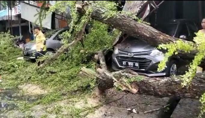 Pohon tumbang tersebut terjadi di kawasan Jalan Ahmad Yani, Karang Jati, Balikpapan Tengah, dan menimpa dua unit mobil yang terparkir di bawah kanopi.