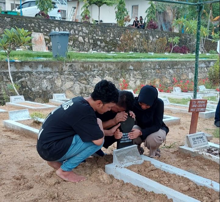 Suami dan dua anak dr Suryani memasang batu nisan di pusara sang ibu.