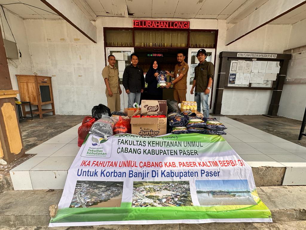 KaltimKita.com, TANA PASER - Ikatan Alumni Fakultas Kehutanan Universitas Mulawarman (IKA FAHUTAN UNMUL) Cabang Kabupaten Paser menyerahkan bantuan ke posko banjir di Kelurahan Long Kali pada Selasa 28 Maret siang.