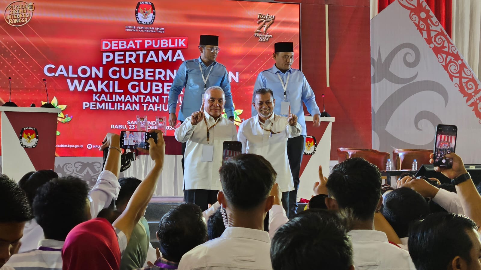 DEBAT pertama Pilgub Kaltim 2024 berlangsung Rabu (23/10) malam . Acaranya dipindahkan KPU dari ballroom Hotel Mesra ke Planery Hall GOR HM Kadrie Oening Sempaja Samarinda. Tempatnya memang lebih luas untuk menampung 400 undangan.