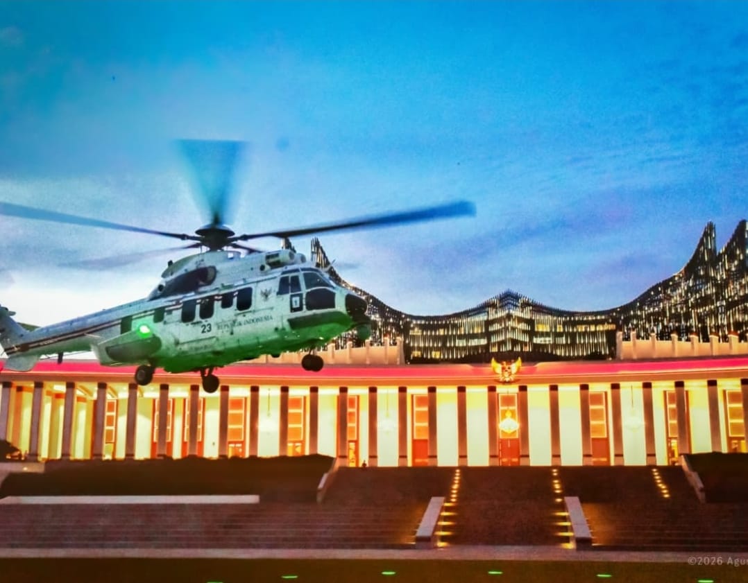 Pemandangan menarik ketika helikopter Presiden Prabowo mendarat di halaman Istana Garuda IKN pada senja hari.(Ist)