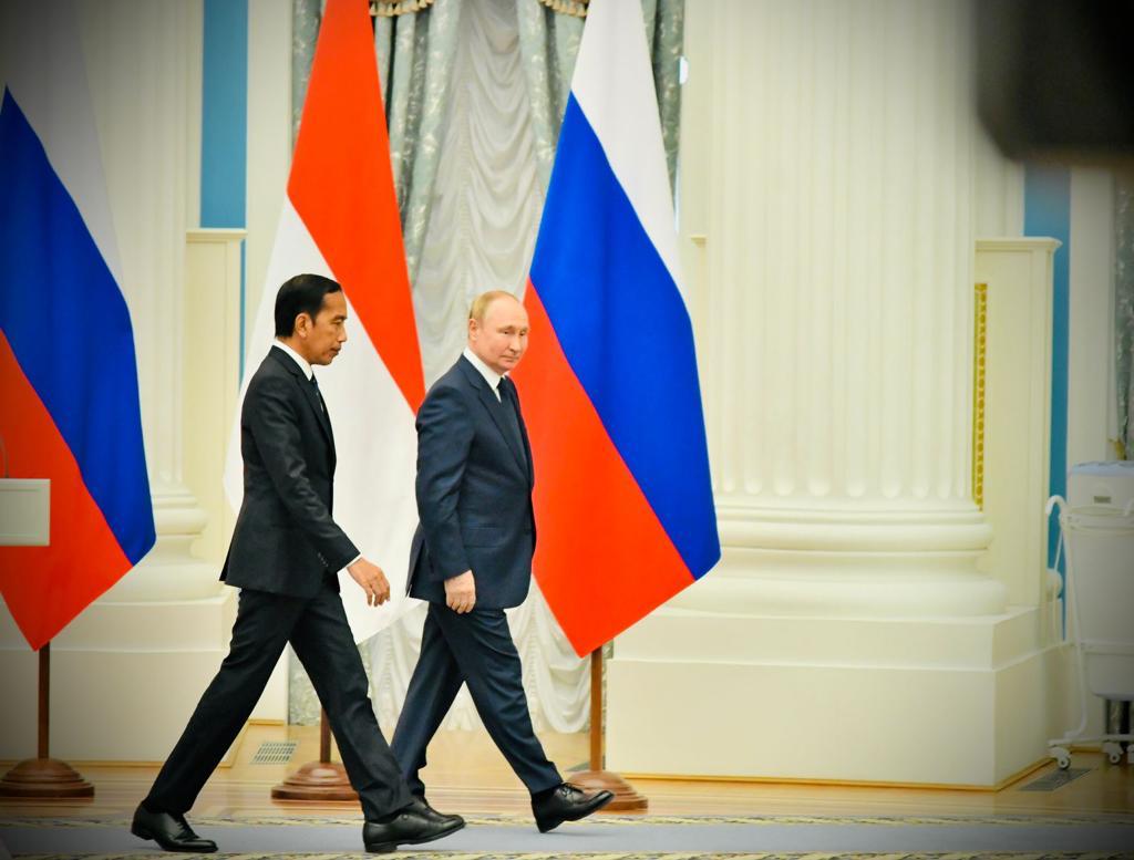 “Isu perdamaian dan kemanusiaan selalu menjadi prioritas politik luar negeri Indonesia. Dalam konteks inilah, saya lakukan kunjungan ke Kyiv dan Moskow,” kata Presiden Jokowi saat menyampaikan keterangan pers bersama dengan Presiden Putin.