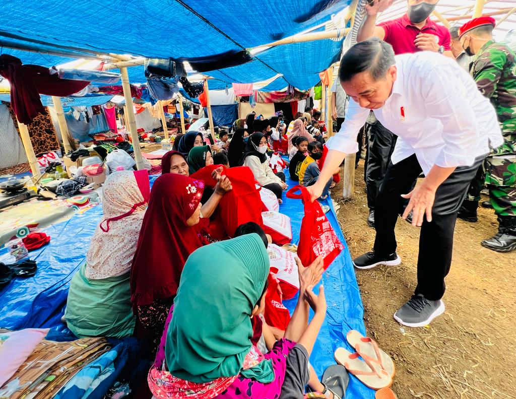 CIANJUR- Presiden Joko Widodo meninjau dan menyapa para penduduk yang mengungsi di Posko Bantuan Paspampres Peduli Cianjur, Desa Cijedil, Kecamatan Cugenang, Kabupaten Cianjur, Provinsi Jawa Barat, pada Senin, 5 Desember 2022.