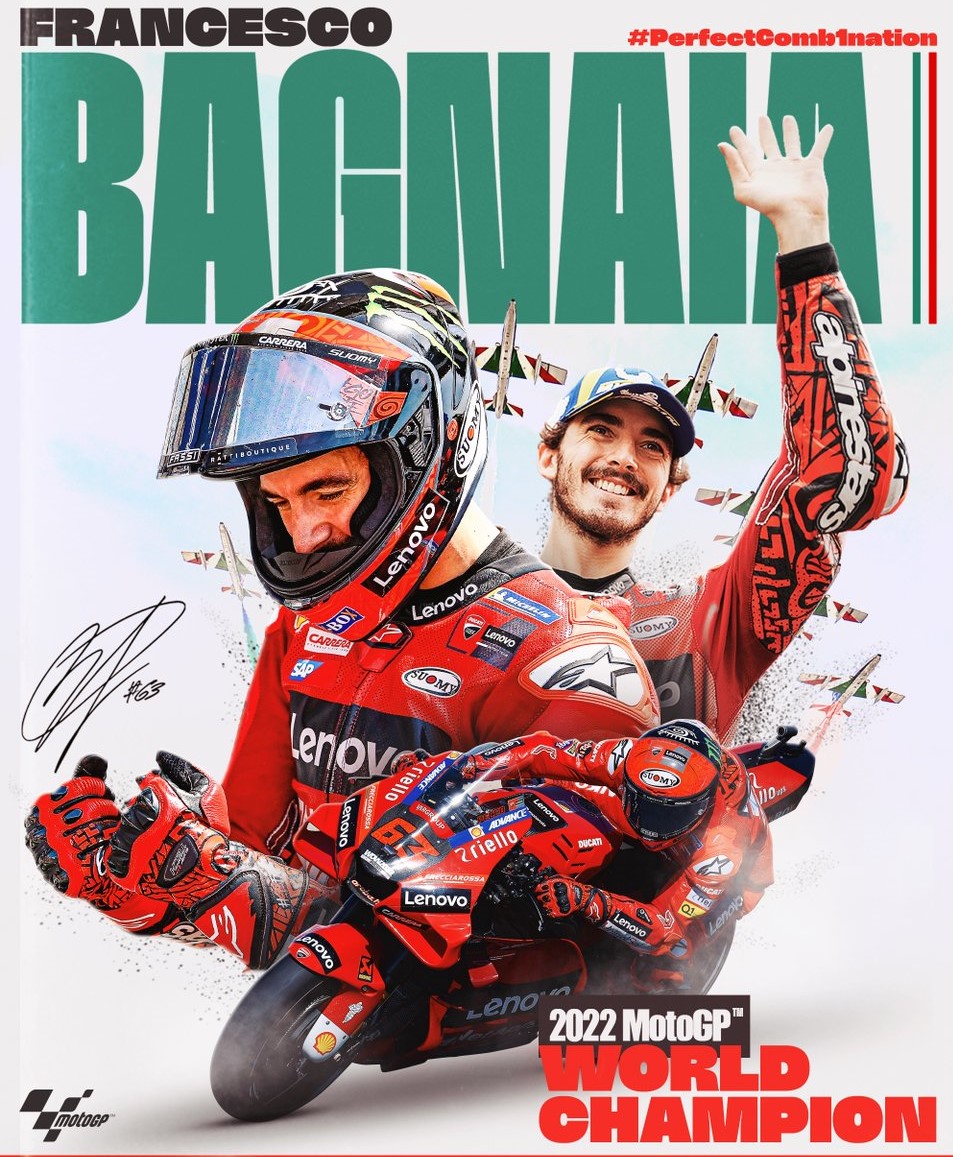 Lebih hebatnya lagi, Bagnaia menjadi juara dengan motor keluaran tanah kelahirannya sendiri, Italia. FB63 mengikuti jejak Giacomo Agostini sebagai Italiano yang juara dunia dengan motor pabrikan Italia.