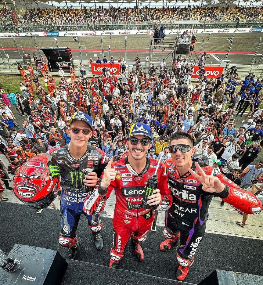 Di Sirkuit Internasional Pertamina Mandalika, Minggu (15/10/2023), rider Ducati, Bagnaia, melahap 27 lap dengan catatan waktu 41 menit 20,293 detik. Dia dikuntit oleh Maverick Vinales dan Fabio Quartararo sebagai pelengkap podium.