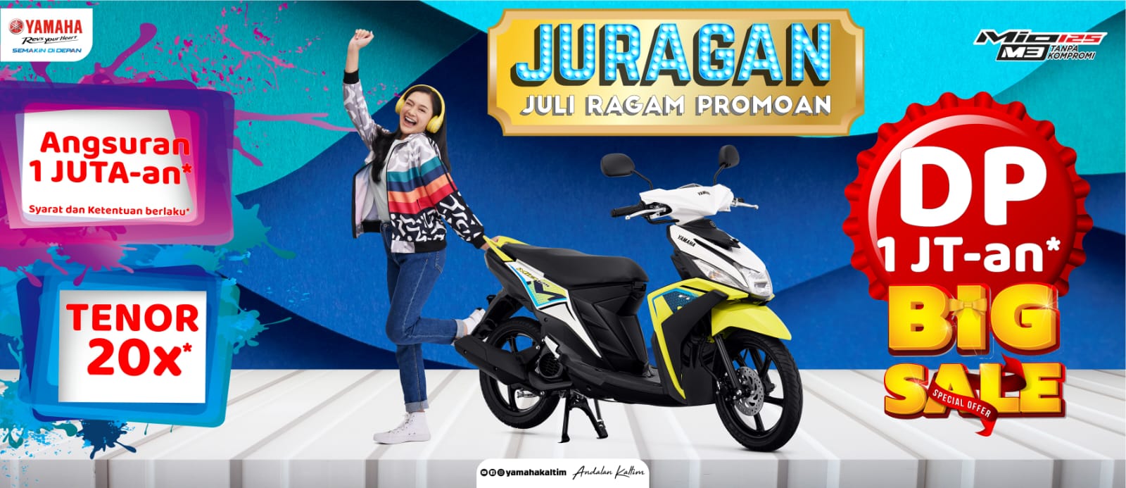 Nih, dengan promo Juragan alias Juli Ragam Promoan, kalian yang pada ngebet pengen motor cantik Yamaha Mio M3 tidak bakal kesulitan. Pasalnya hanya dengan DP alias uang muka sebesar Rp 1 juta an* saja sudah bisa bawa pulang Yamaha Mio M3.