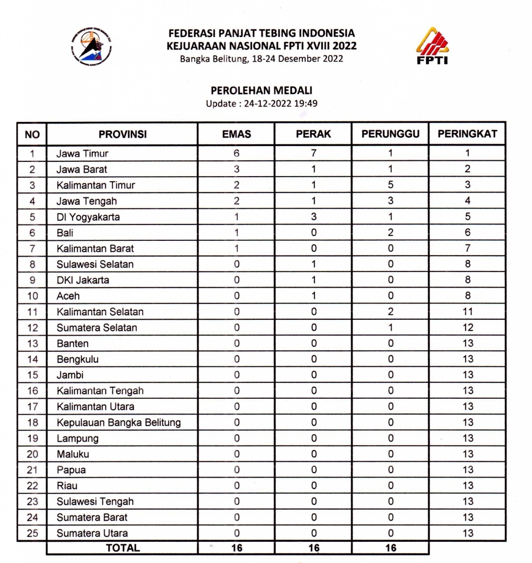 Pada Kejurnas Panjat Tebing XVIII di Bangka Belitung yang berlangsung 18 – 24 Desember tersebut, FPTI Kaltim berhasil meraih 2 emas, 1 perak, dan 5 perunggu. Peringkat kedua diduduki Jawa Barat yang merebut 3 emas, 1 perak, dan 1 perunggu. Sedangkan Jawa Timur keluar sebagai juara umun dengan 6 emas, 7 perak, dan 1 perunggu.