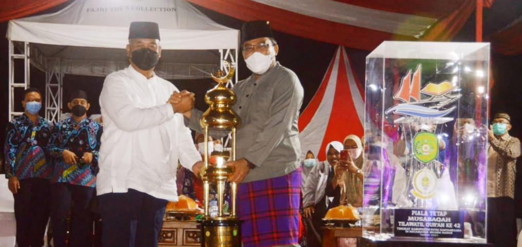 Kaltimkita.com, Kutai Kartanegara - Perhelatan Musabaqah Tilawatil Quran (MTQ) ke-42 tingkat Kabupaten Kutai Kartanegara (Kukar) tahun 2021 telah usai, Kafilah Tenggarong keluar sebagai juara umum, disusul Muara Bada dan Loa Janan. Bupati Kukar, Edi Damansyah langsung menyerahkan piala bergilir kepada Camat Tenggarong, Arfan Boma, di lapangan Mutiara Kecamatan Muara Badak, Rabu (3/11/2021) malam.
