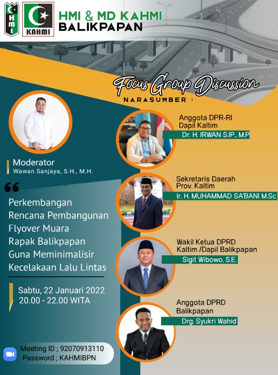 Kaltimkita.com, BALIKPAPAN - Pasca terjadinya kecelakaan lalulintas di turunan traffic light Muara Rapak Balikpapan, Korp Alumni Himpunan Mahasiswa Islam (KAHMI) Balikpapan menggelar diskusi dengan topik "Perkembangan Rencana Pembangunan Flyover Muara Rapak Balikpapan Guna Meminimalisir Kecelakaan Lalu Lintas" yang menghadirkan Ir H Muhammad Sa'bani M.Sc (Sekda Provinsi Kaltim), Dr.H. Irwan, S.IP., M.P (Anggota DPR-RI Dapil Kaltim), Sigit Wibowo S.E (Wakil Ketua DPRD Kaltim/Dapil Balikpapan, drg. Syukri Wahid (Anggota DPRD Balikpapan) yang dipandu akademisi muda Universitas Balikpapan, Wawan Sanjaya.