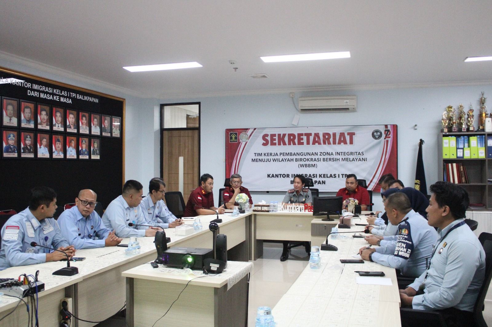 Kaltimkita.com, BALIKPAPAN - Dalam upaya mewujudkan Wilayah Birokrasi Bersih dan Melayani (WBBM), Selasa (25/07) Kepala Kantor Wilayah Kementerian Hukum dan HAM Kalimantan Timur, Sofyan didampingi oleh Kakanim Balikpapan, Wahyu Gumilang, memberikan penguatan kepada Tim Pokja Pembangunan Zona Integritas (ZI) Kantor Imigrasi Balikpapan.