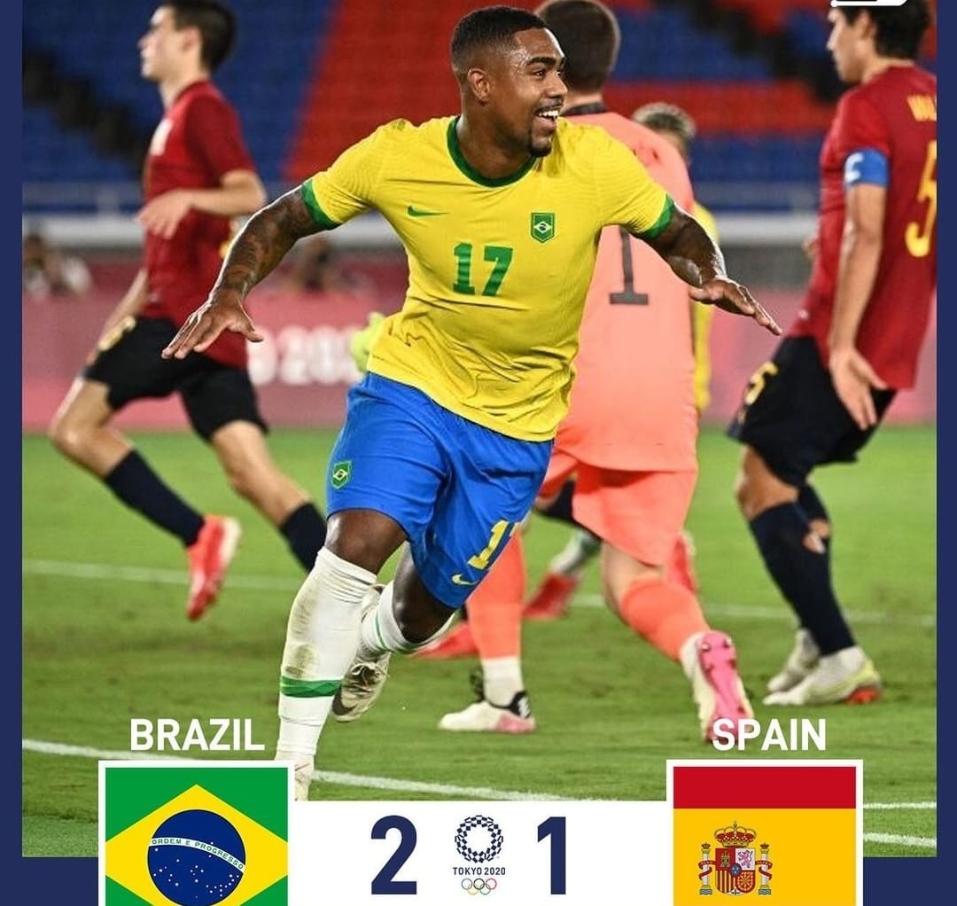GOL! Brasil mencetak gol kedua di menit ke-109. Malcom menerima bola umpan lambung Antony di sisi kiri, sebelum membawa bola ke kotak penalti dan menendangnya masuk ke gawang Spanyol.